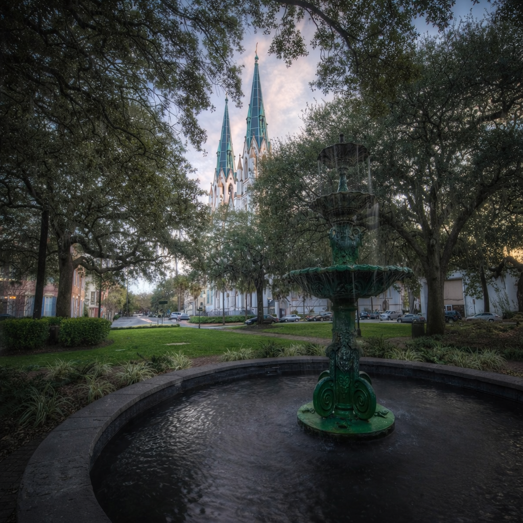 The Spirits and Scoundrels Ghost Tour begins beside the water fountain in Lafayette Square, one of the city’s most charming and storied landmarks. Surrounded by historic homes and the soft glow of gaslight, it’s the perfect place to start your journey into Savannah’s haunted past.