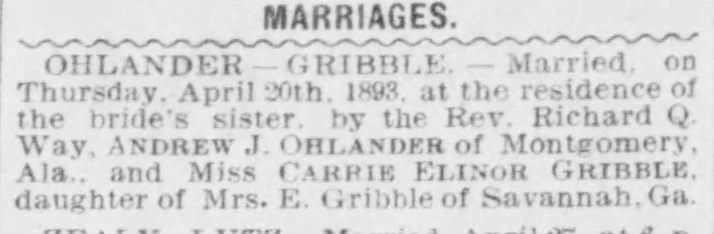 A close-up scan of an old newspaper marriage announcement titled “Marriages,” reporting the 1893 wedding of Andrew J. Ohlander of Montgomery, Alabama, and Miss Carrie Elinor Gribble of Savannah, Georgia, held at the residence of the bride’s sister and officiated by Rev. Richard Q. Way.