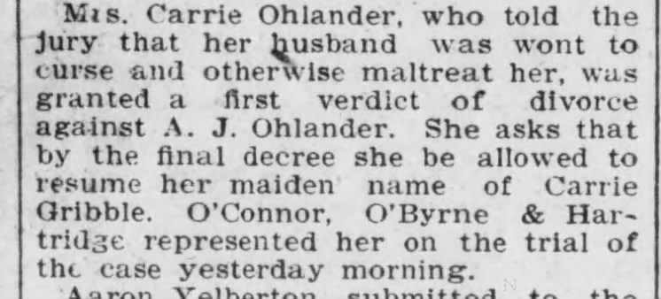 A close-up of a historic newspaper clipping describing a divorce case in which Mrs. Carrie Ohlander testifies that her husband, A. J. Ohlander, cursed and mistreated her, resulting in a first verdict of divorce and her request to resume her maiden name, Carrie Gribble.
