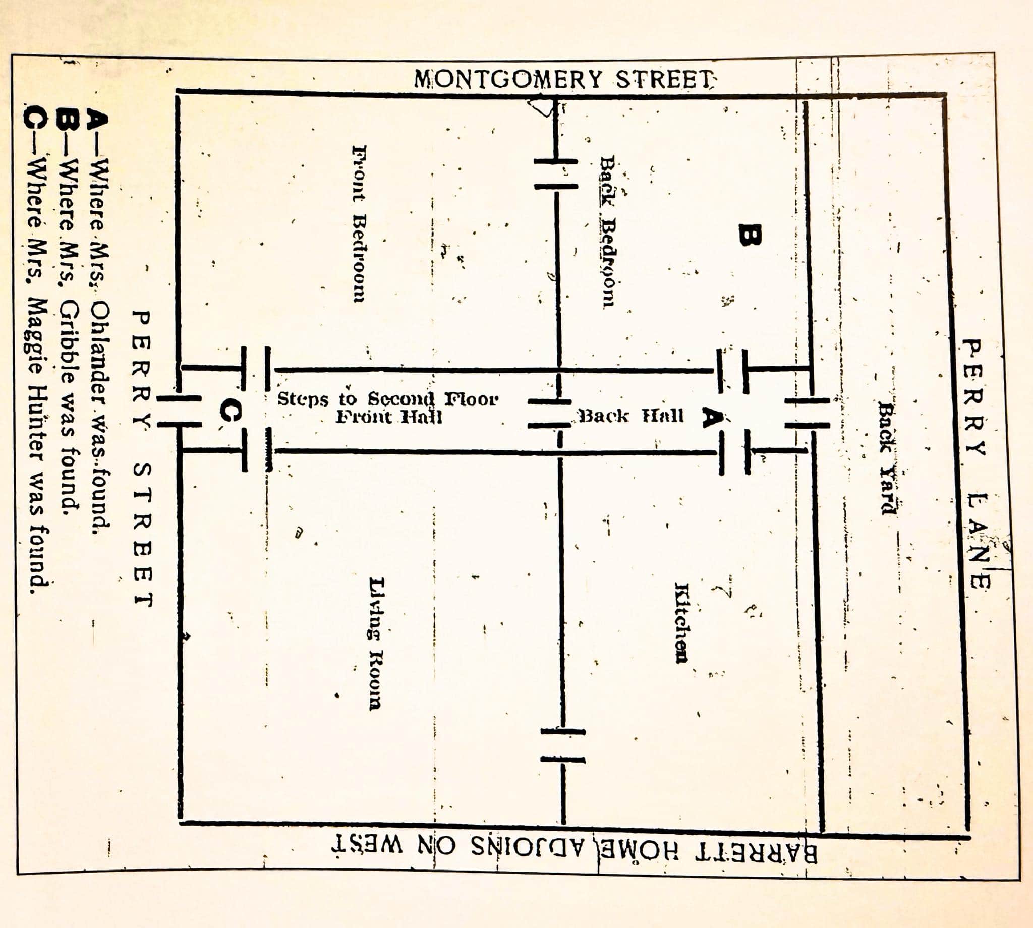 A historic, hand-drawn floor plan of the Gribble House showing room layouts and street orientations, with Montgomery Street at the top and Perry Street on the left. The map labels the living room, kitchen, front and back bedrooms, front and back halls, steps to the second floor, and a backyard along Perry Lane, with notes indicating where Mrs. Ohlander, Mrs. Gribble, and Mrs. Maggie Hunter were found.