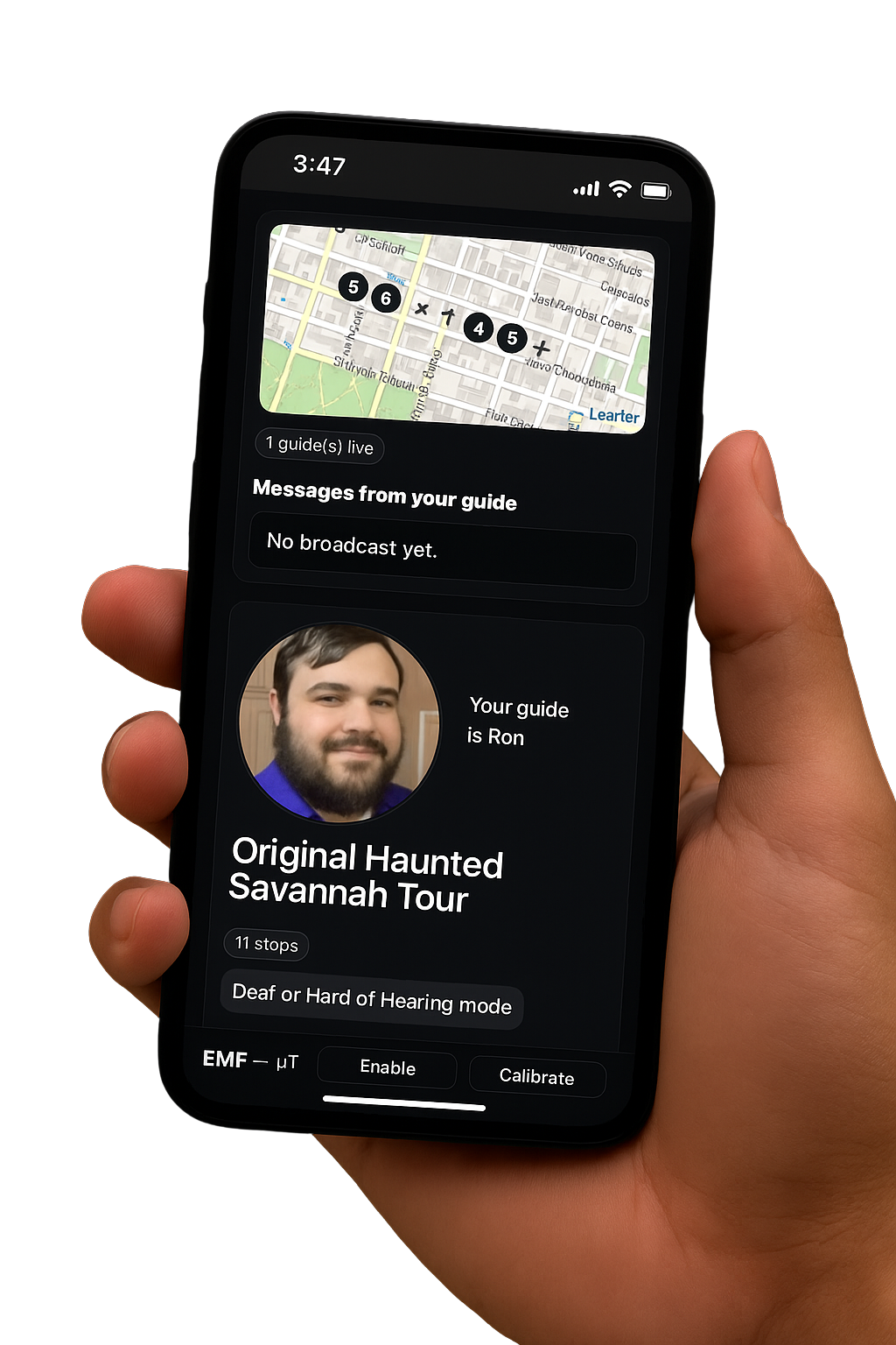Simple, seamless, and immersive—the Tour Companion keeps you connected to your guide, your group, and the ghosts that never left.